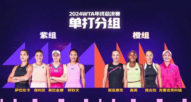 根据赛事规则,参加单打的8名球员分成两个小组,经过抽签,郑钦文与萨巴伦卡、保利尼、莱巴金娜同分在紫组;斯瓦泰克、高芙、佩古拉、克雷吉茨科娃同分在橙组,每个小组进行单循环赛,小组前两名晋级四强。