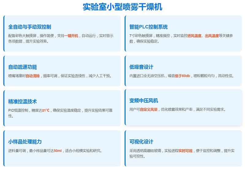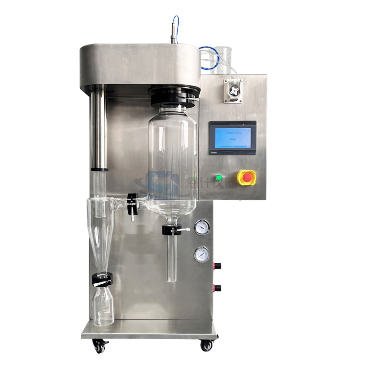 推荐选择具备以下核心功能的小型喷雾干燥机(送风款,二流体喷雾雾化结构),其进料量可通过进料蠕动泵调节,样品小量可达50ml,且能满足实验需求: