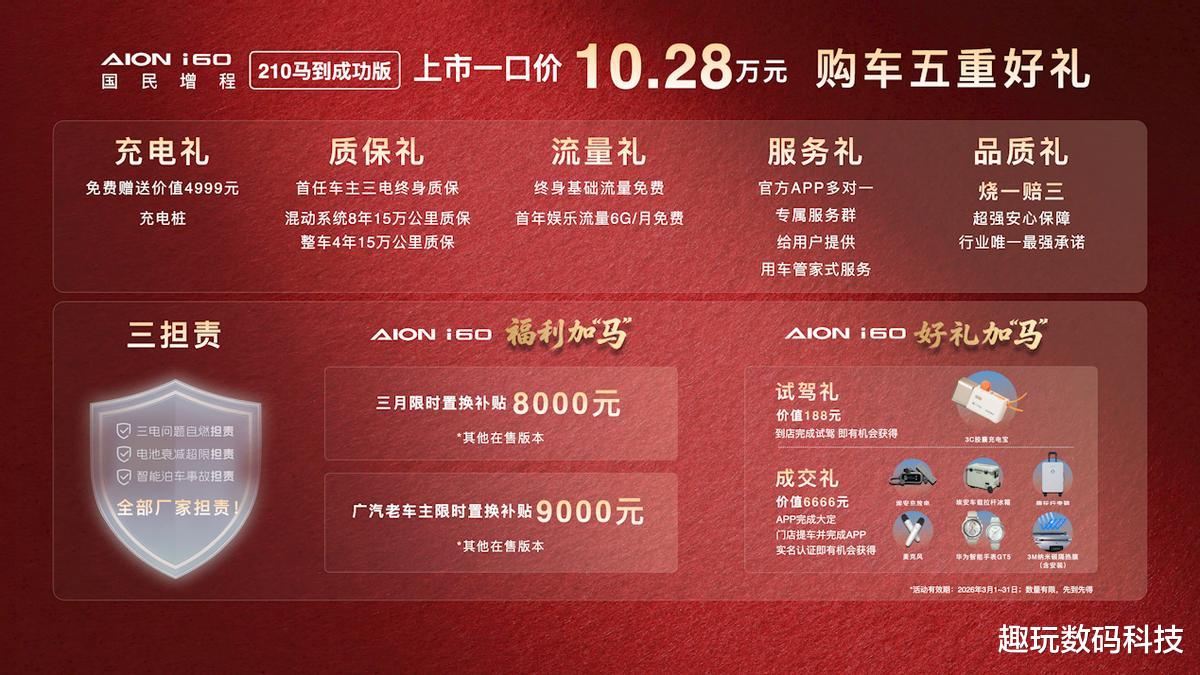 以A级增程SUV的“入门价”,买同级“天花板”。除了越级体验,i60马到成功版还拥有行业最强“烧一赔三”、和“三电问题自燃、电池衰减超限、智能泊车事故,全部厂家担责”的“三担责”保障。此外,官方还推出3月限时置换补贴,i60其他在售版本,3月限时置换补贴8000元;广汽老车主,限时置换补贴9000元!