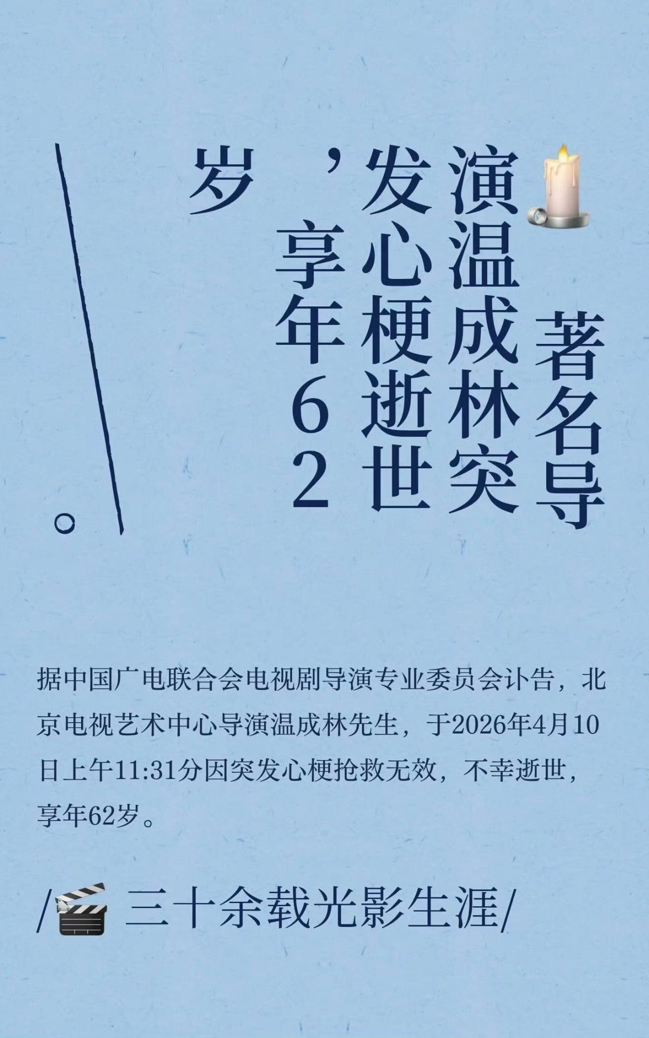 2026年4月11日,中国广电联合会电视剧导演专业委员会发讣告,温成林先生于2026年4月10日上午11:31分因突发心梗抢救无效,不幸逝世。
