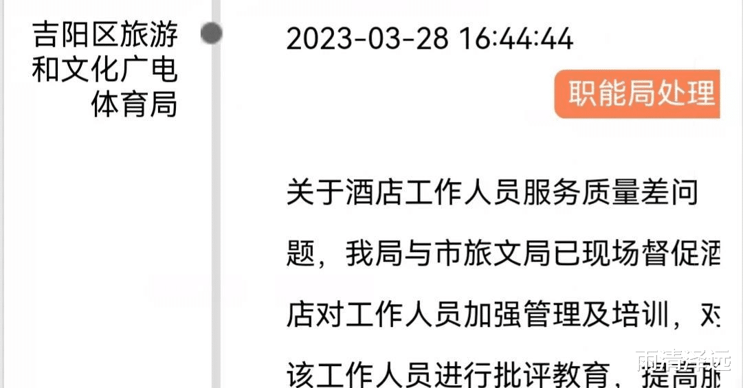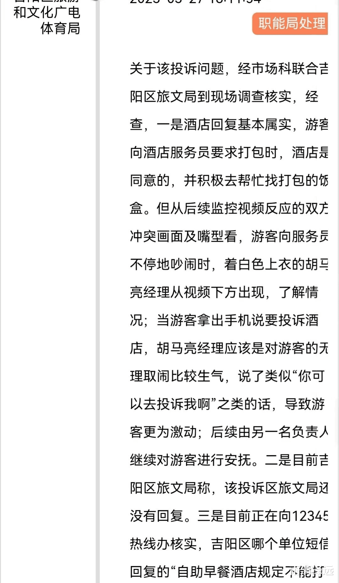 在现场发生冲突后,我当即打了三亚12345热点投诉,请求相关部门现场解决冲突。热线很给力,当下就联系了辖区三亚吉阳区旅文局,然而等了很久,三亚吉阳区旅文局没有工作人员到现场,更没有人打电话咨询投诉人,直到十一点多我才收到一个敷衍短信,吉阳区旅文局回复称:自助早餐酒店规定不能打包。