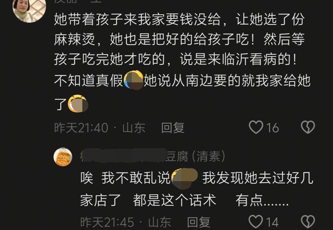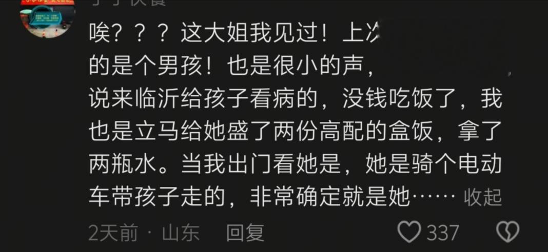 还有账号为某快餐的店主留言:这位大姐我见过!上次来我店里带的是个男孩!也是很小的声,同样的话术……给她盛了两份高配的盒饭,拿了两瓶水。当我出门看她时,她是骑着电动车带着孩子走了,非常确定是她……