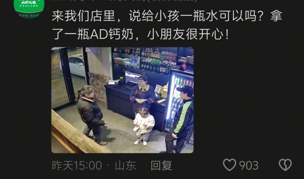 账号为某火锅店的网友表示:来我们店里,想给孩子要一瓶水喝,店主给拿了一瓶AD钙奶,并表示小女孩很开心!