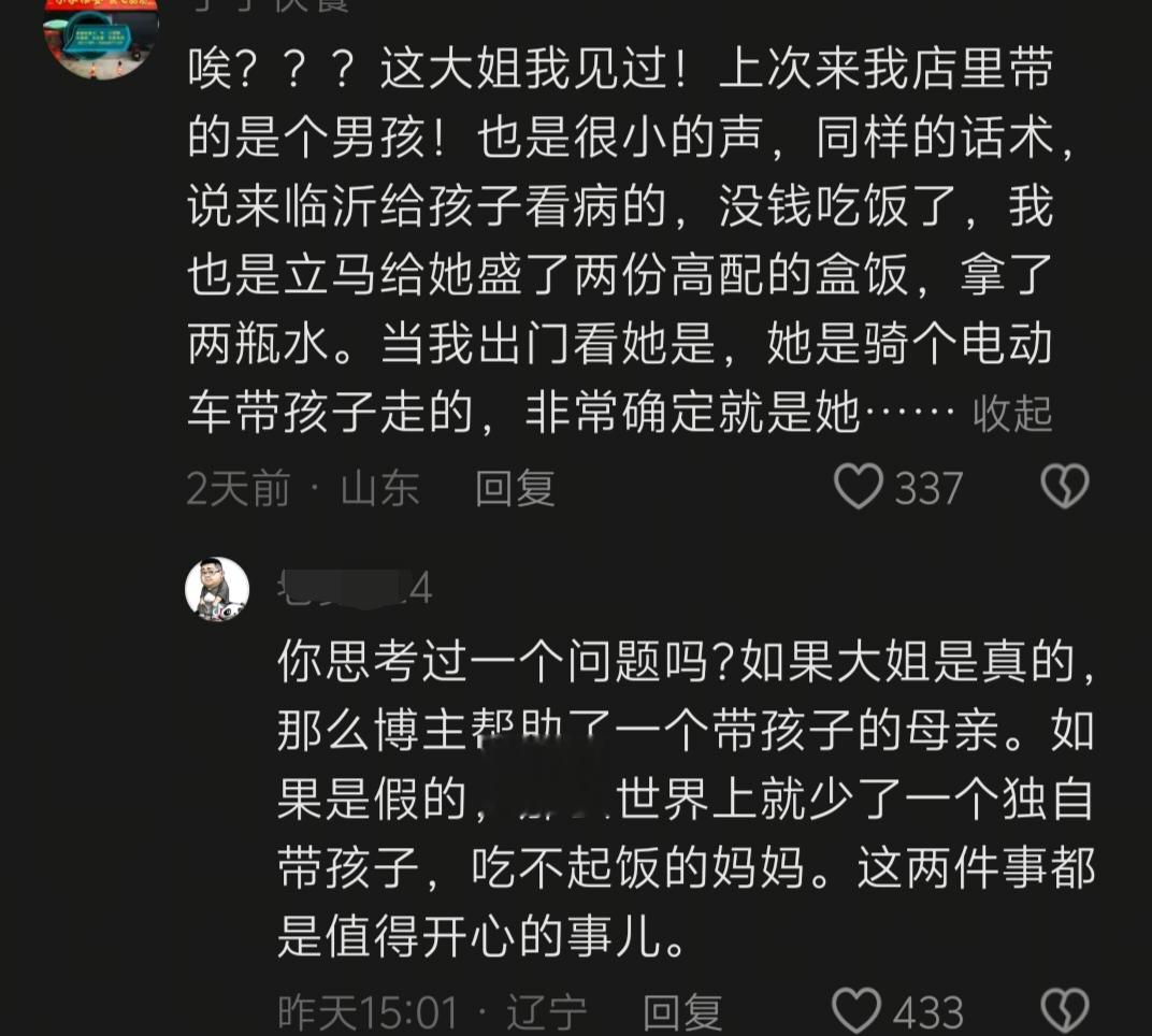 正如一位朋友在回复中说的那样,如果大姐是真的,那么小李老板帮助了一个带孩子的母亲。如果是假的,那么世界上就少了一个独自带孩子,吃不起饭的妈妈。