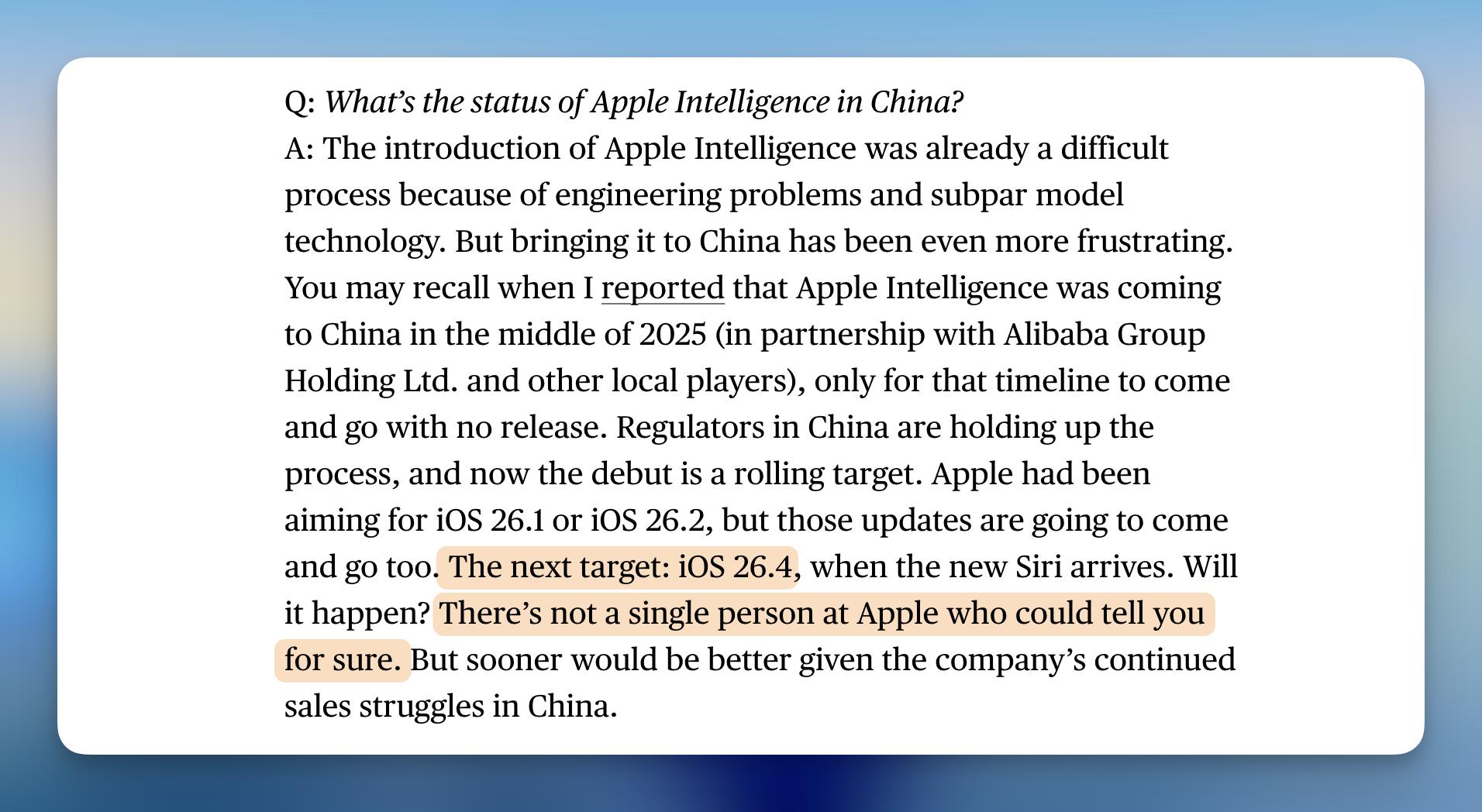 在最新一期的 Power On 通讯 QA 环节中,Gurman 谈到了 Apple Intelligence 入华的最新进展。他表示,由于工程问题复杂,加上模型技术仍未达到理想水平,整个 Apple Intelligence 的开发过程本就困难重重,而要将其引入中国市场更是难上加难。