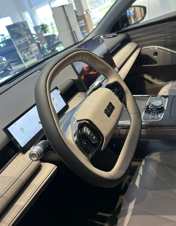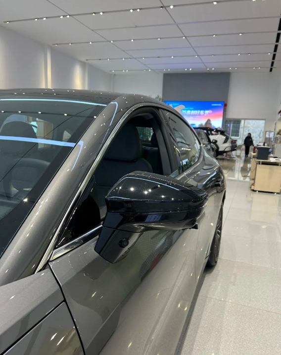 刚进店就被五米长的无框车门闪到,溜背造型配上隐藏式门把手,确实是好看啊。看了一下新推送的哨兵模式,手机远程查看泊车画面,连轮胎上沾的树叶都拍得清清楚楚,锁车时还能选自己录的音频当提示音哈哈哈