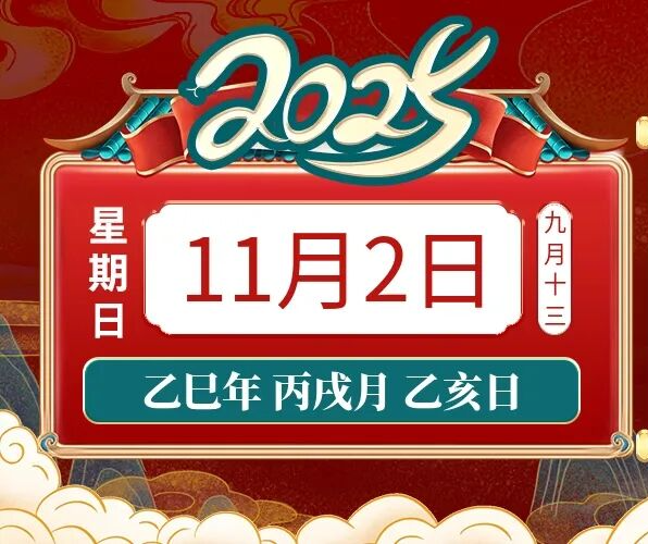 2025年11月2日,星期日,农历九月十三 (乙巳年丙戌月乙亥日),法定节假日。