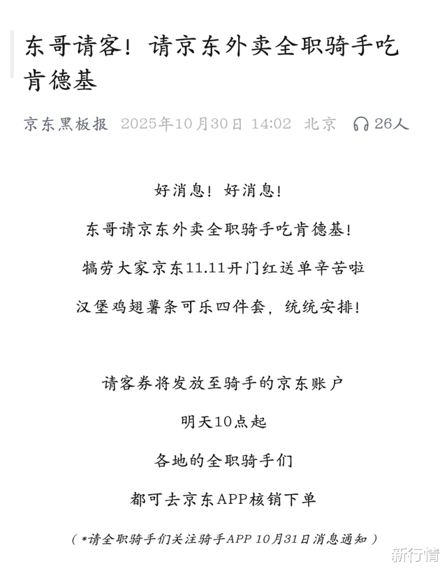 近日,京东黑板报表示,“东哥请京东外卖全职骑手吃肯德基!犒劳大家京东11.11开门红送单辛苦啦。汉堡鸡翅薯条可乐四件套,统统安排!请客券将发放至骑手的京东账户,明天10点起,各地的全职骑手们,都可去京东APP核销下单。”
