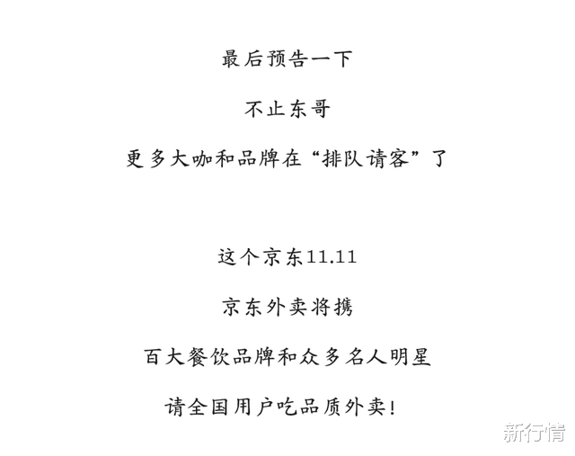 最后,京东还表示,“不止东哥,更多大咖和品牌在‘排队请客’了,这个京东11.11,京东外卖将携百大餐饮品牌和众多名人明星,请全国用户吃品质外卖!”