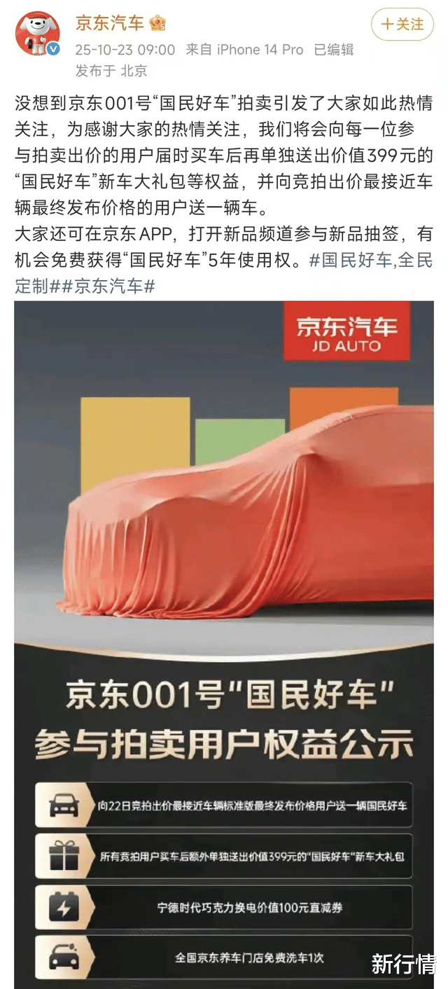 紧接着,为给新车造势,京东将“国民好车”001号特别版在拍卖平台以1元起拍,竞拍需缴纳100元保证金,毁拍仅扣除该保证金。