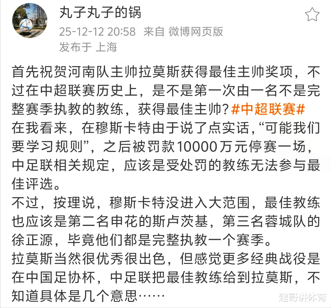 北京时间12月14日,当带队排名中超第10的河南队主教练拉莫斯被足协认定是中超最佳教练后,排名中超第10的教练,拿到中超最佳教练,这样的结果也让很多媒体和球迷感到不服气,上海名记“丸子”的直接发文,认为中超最佳教练,应该按照教练带队在中超的成绩来算,中超第的穆斯卡特因为不当言论被处罚无缘了评选后,中超第2和中超第3的教练,才应该是中超最佳教练的候选人。