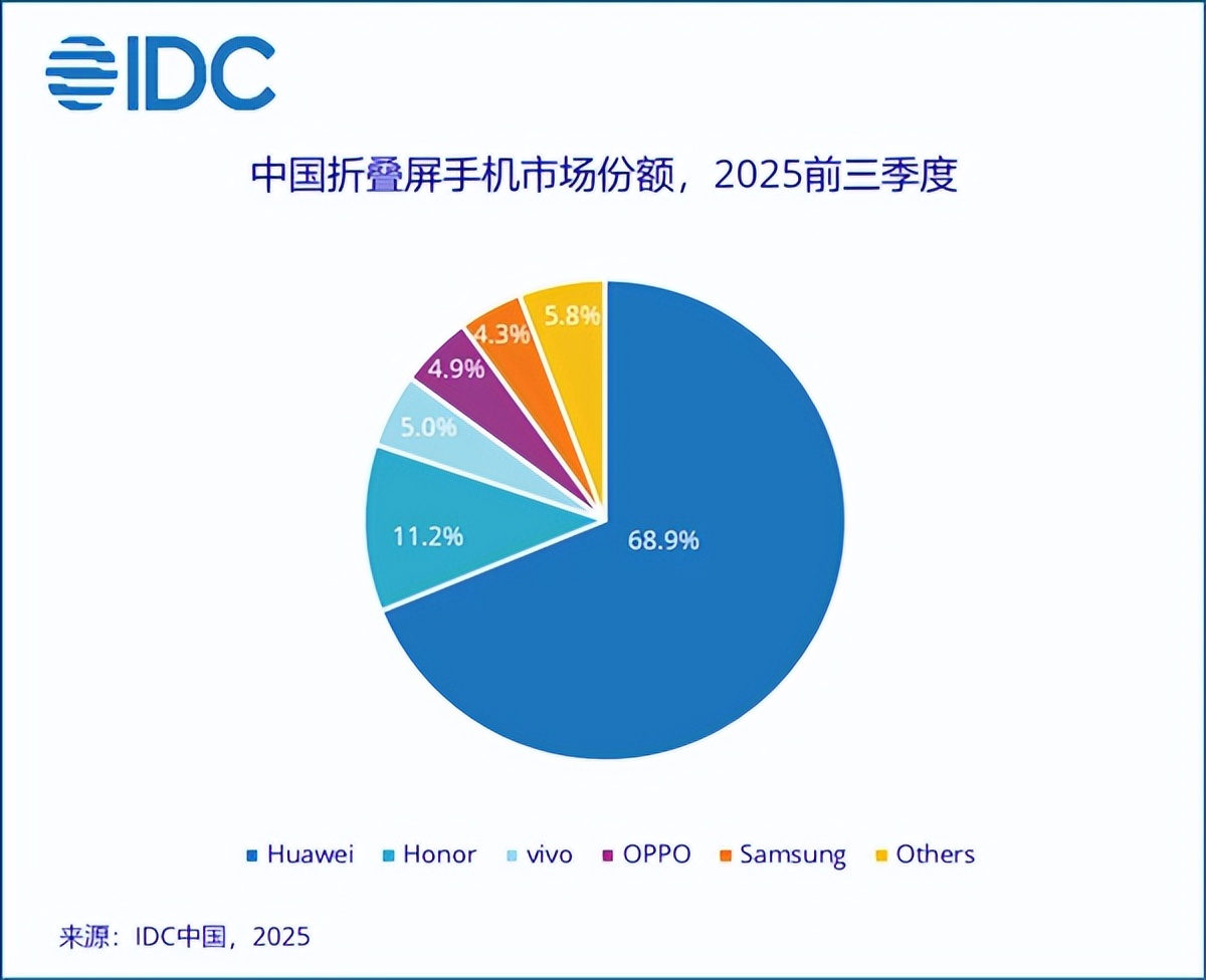 纵观折叠屏领域群雄逐鹿的竞争,有一个品牌始终稳居头把交椅,那就是华为。根据IDC与Counterpoint等权威机构近年发布的调研数据,华为折叠屏手机在中国市场销量连续多年位居第一,不仅占据显著份额(以25年国内前三季度为例,华为占据68.9%份额,断层领先其他品牌),更在技术迭代与用户心智上构建起持续影响力,逐步确立了“一超多强”的行业格局。