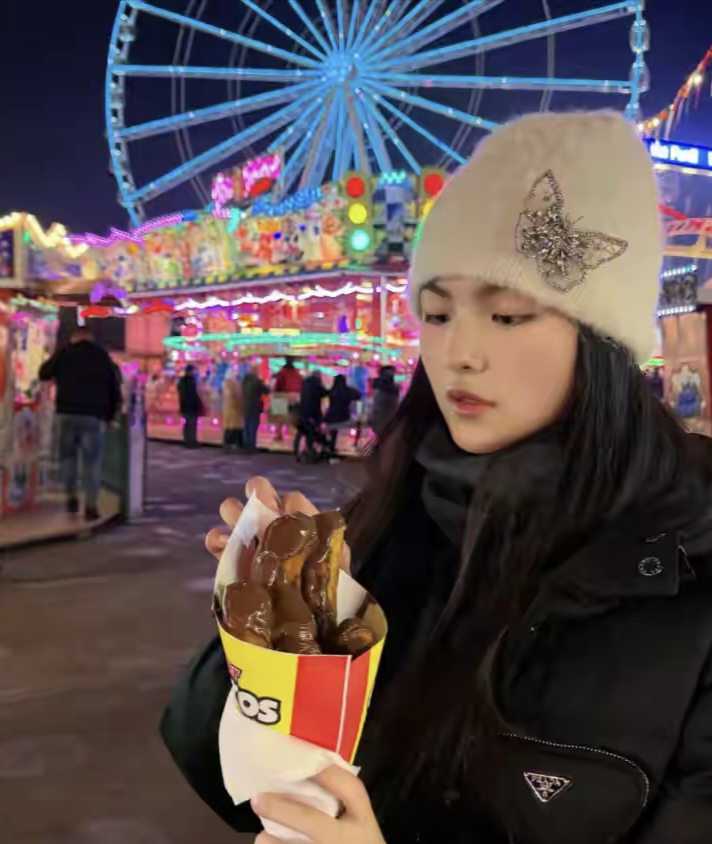 游乐场的环境与国内相差无几。大大的摩天轮下是各种街机游戏和旋转木马,王诗龄还品尝了英国特色美食巧克力鸡蛋仔,这种食物虽然外观普通,但能提供实实在在的热量。