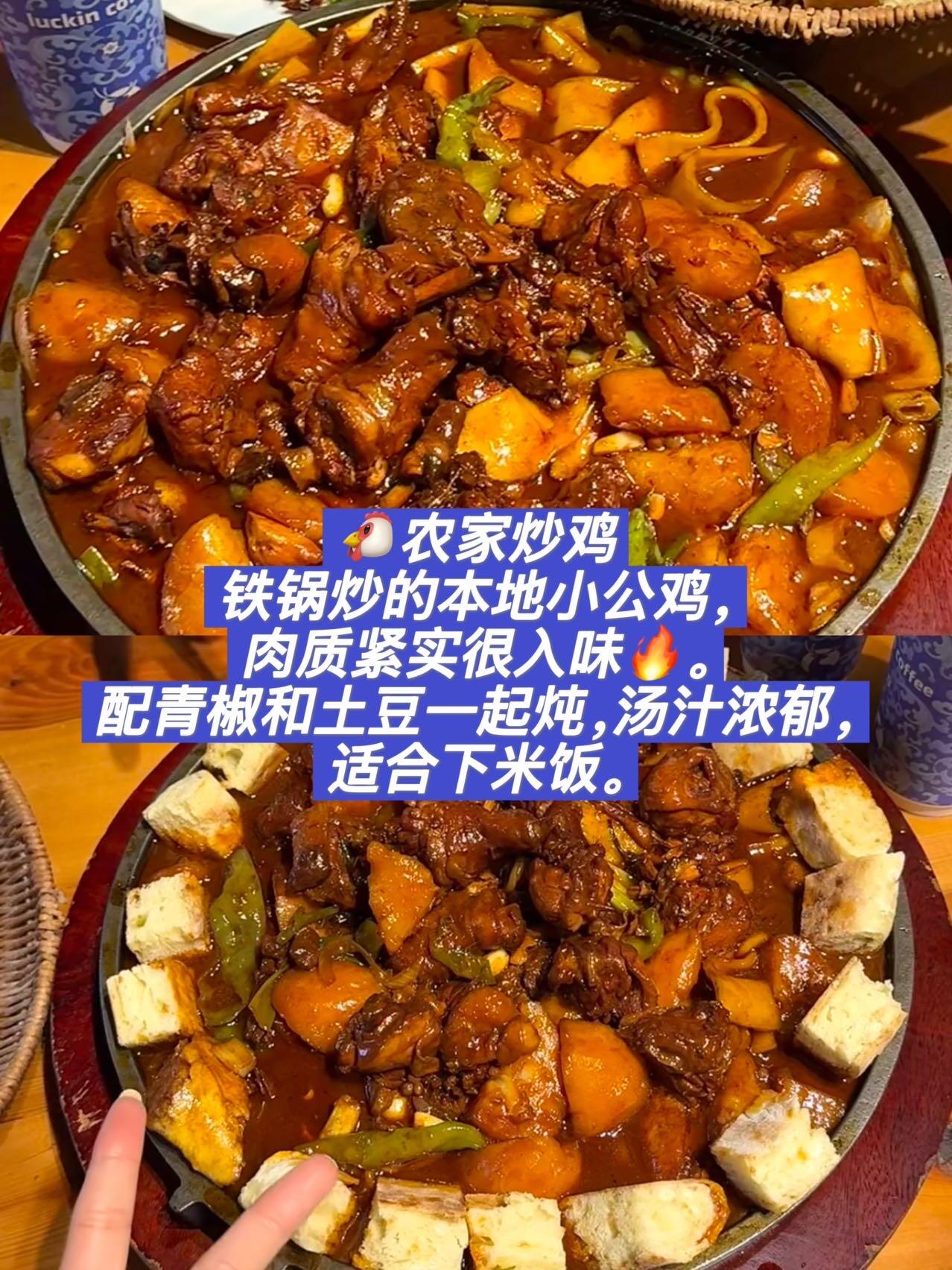 铁锅炒的本地小公鸡,肉质紧实很入味🔥。配青椒和土豆一起炖,汤汁浓郁,适合下米饭。