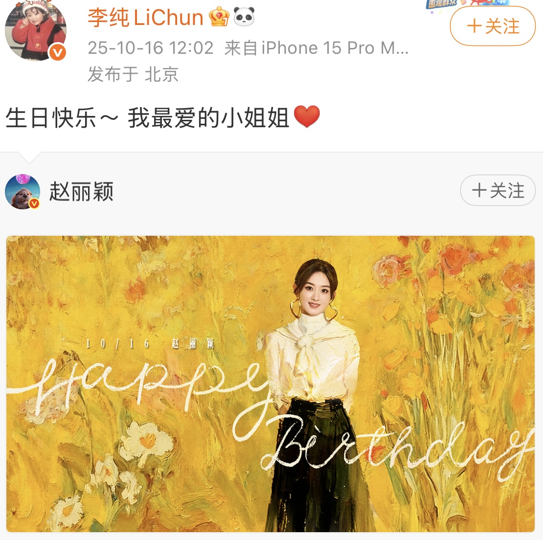 10月16日的庆生微博中,李纯没有用“女神”“好友”等客套词,而是直白喊出“我最爱的小姐姐”。这句充满生活气息的称呼,瞬间击中网友:有人翻出2017年李纯的采访,她曾说“赵丽颖是我戏外的心灵导师”;有人对比两人十年前的片场照与如今的合照,感慨“颜值未变,情谊更浓”;更有人制作“霓漫天与花千骨的十年对比图”,戏称“反派和女主的HE结局,只在戏外”。