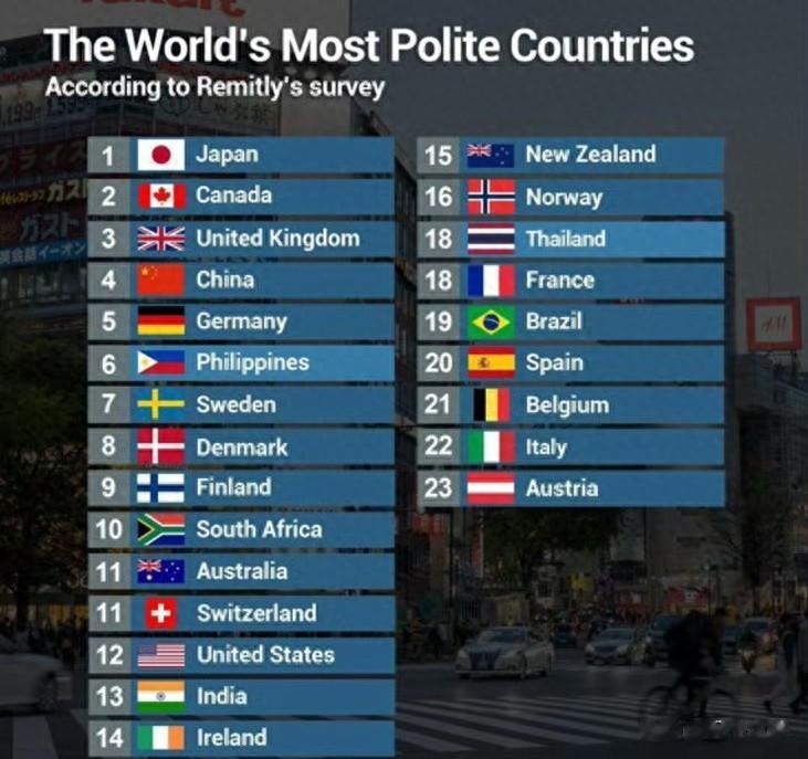 其实这个调查并不能全面反映一个国家的礼貌程度,因为它没有客观标准,仅凭投票者自己的主观印象,这里面甚至有许多网友根本没有去过列出的国家。