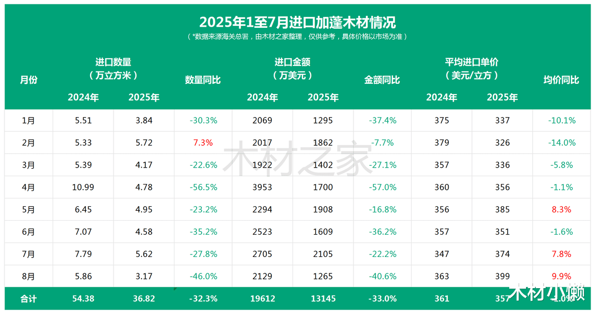 来看8月中国进口方面。海关数据显示,2025年8月,中国自加蓬进口木材3.17万立方米,同比锐减46%,环比7月再降43.7%;对应金额同步下降40.6%至1265万美元,环比收缩39.9%。自今年3月以来,我国对加蓬木材进口量已连续6个月低于上年同期;8月更创年内新低,下行通道进一步确认。