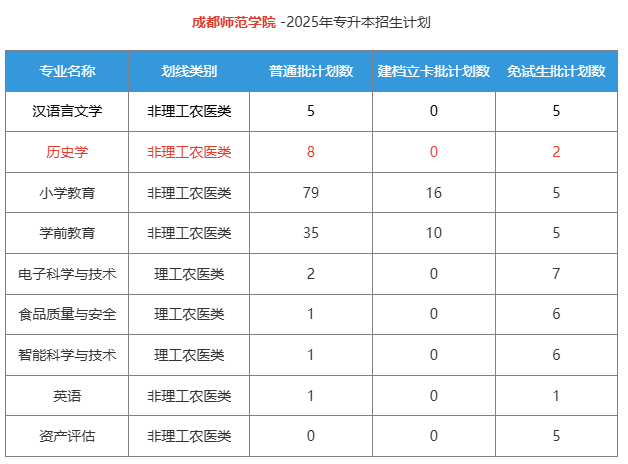 成都师范学院2025年专升本招生计划有200人,共招收9个专业招生,分别是汉语言文学、历史学、小学教育、学前教育、英语、资产评估、电子科学与技术、食品质量与安全、智能科学与技术。