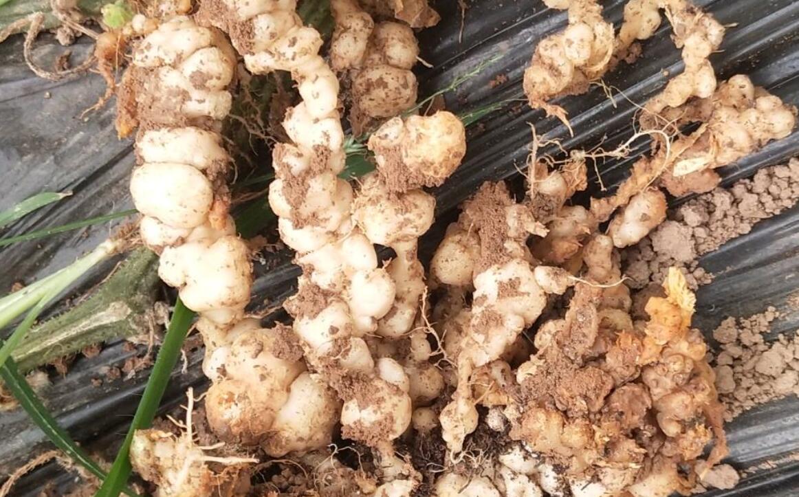 根结线虫,它是一种病菌。它的病情最主要的表现,那就是根瘤。也就是在根系的位置长很多瘤一样的东西,这个就是根结线虫的表现。而且是在整个根系进行盘接,形成一团团的,从而导致作为根系对于营养元素的吸收。对于作物而言,它的生长就会出现问题。大体上的表现就是作物的生长速度非常慢,而且叶面的也没任何的光泽。