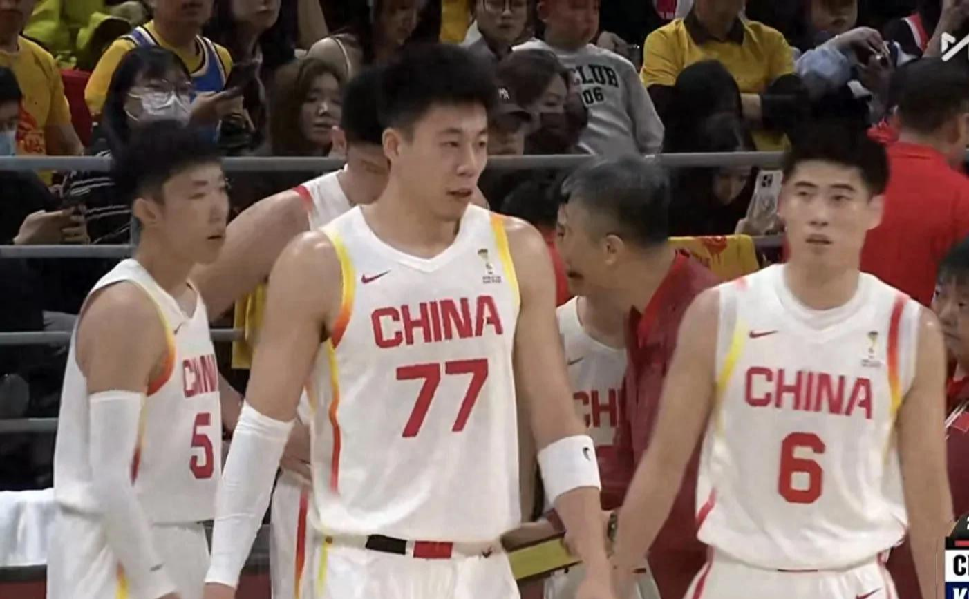 最后1分53秒。全场紧逼,中国男篮抢到球权,高诗岩外线投篮卡到篮脖子,张镇麟三分命中,李贤重篮下打进,张镇麟三分再中。74比79!双方分差5分!