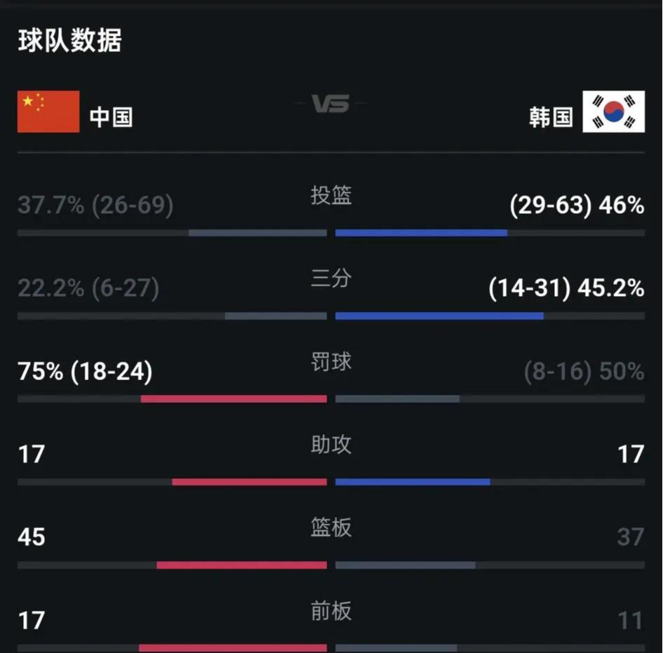 整场比赛,中国男篮69中26,37.7%的命中率。低于韩国63中29,46%的命中率。