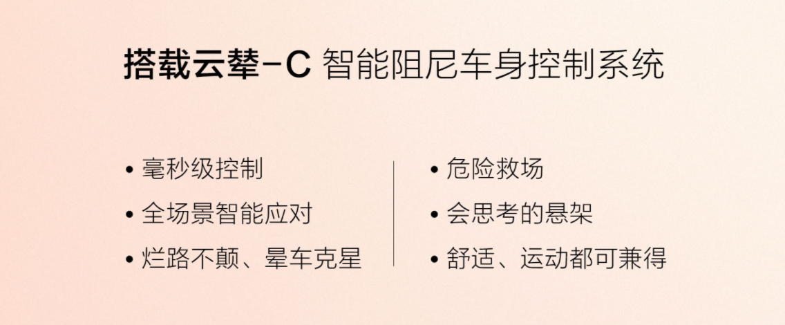 云辇-C智能阻尼车身控制系统,通过强化整车垂直方向的控制,实现了舒适与运动的黄金平衡,尤其对易晕车用户更为友好。在颠簸路面,它能提供更稳定的乘坐体验;在急转、加速或制动时,让车辆操控更加精准;紧急避险时,更能有效减少车身倾斜和滑动,大幅提升车辆操控安全性。