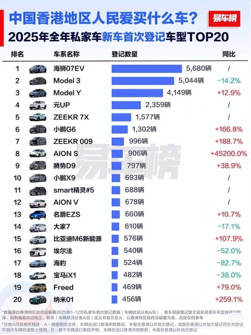 凭硬核实力改写市场格局!2025 年,比亚迪在香港车市创下历史纪录,全年卖出 9751 辆新车,首次拿下全品牌销量冠军;其中海狮 07EV 热销 5680 辆,成为香港最畅销车型,一人包揽 “品牌 + 车型” 双料冠军,直接打破外资品牌长期霸榜的局面。