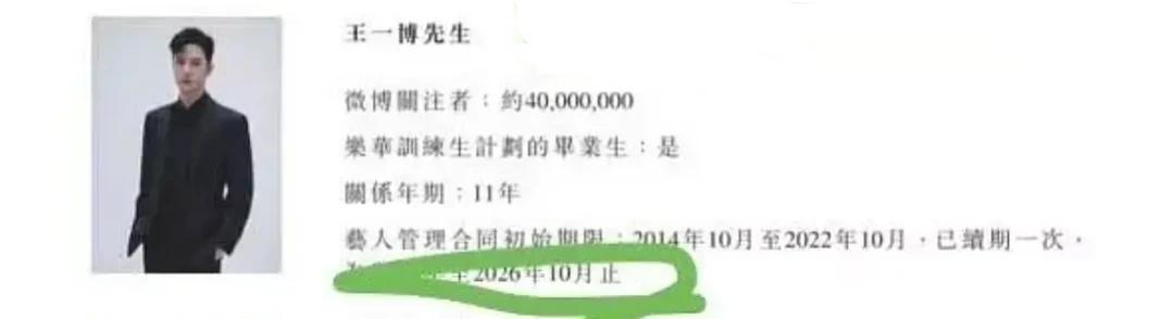 据说,王一博22年续约时,取消了合同里自动续约的条款。所以,继24年UNIQ团合约到期后,王一博的个人合约26年10月到期。