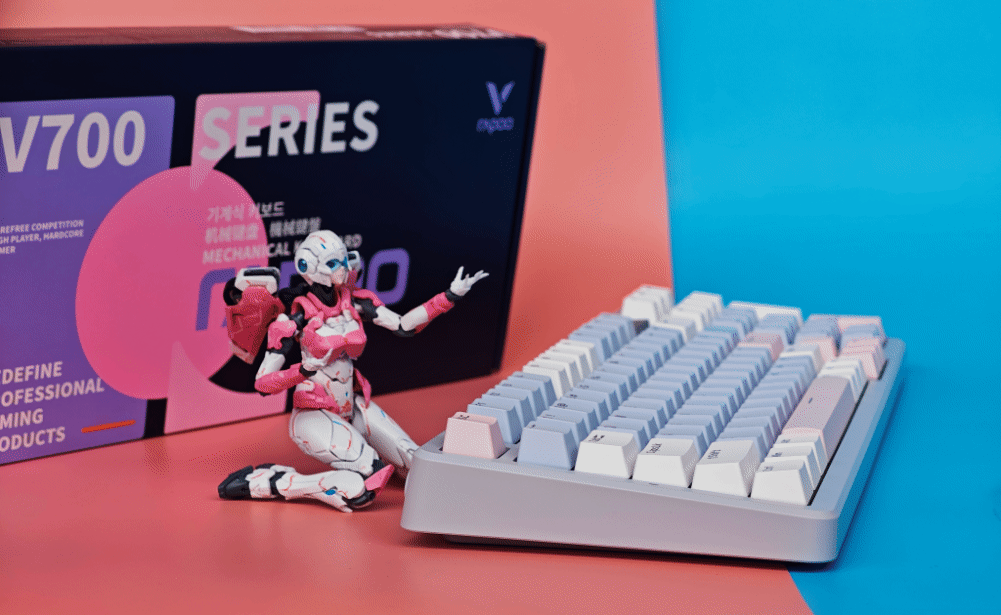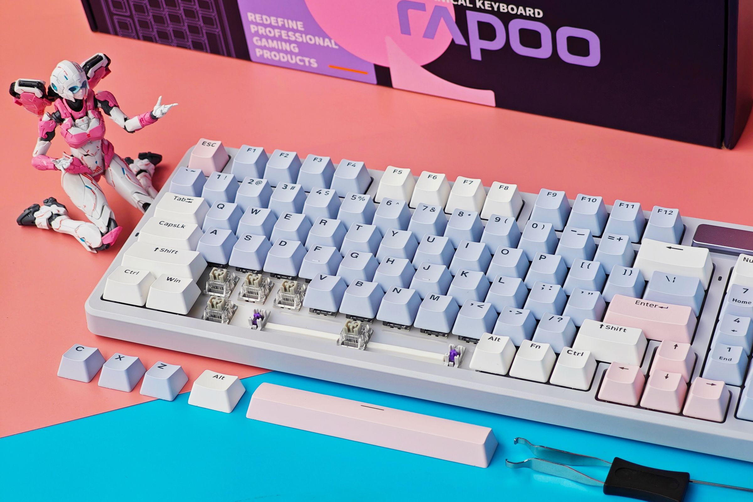 ▲身为一名猛男,自然得选“猛男粉”(莫奈仙踪,其他还有两个酷酷的颜色)。雷柏V700DIY-98三模机械键盘外包装采用了撞色设计,优雅别致。