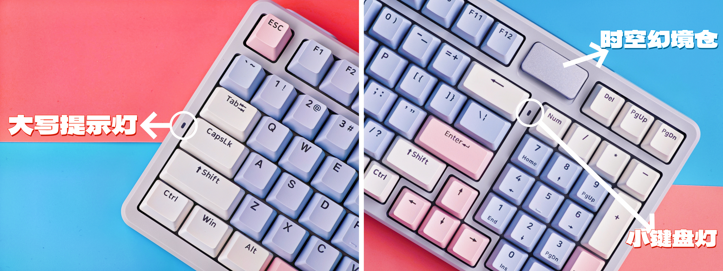 ▲这款键盘有个细节我很喜欢,就是它的键盘指示灯设计。一般键盘都选择将指示灯堆在一起,导致有时候分不清。而雷柏V700DIY-98则是采用了独立而且高亮度的大写提示灯、小键盘灯,让用户更容易GET到键盘的状态,细节处尽显匠心。而在小键盘区的上方,还有一个“时空幻境仓”,咱们接着看: