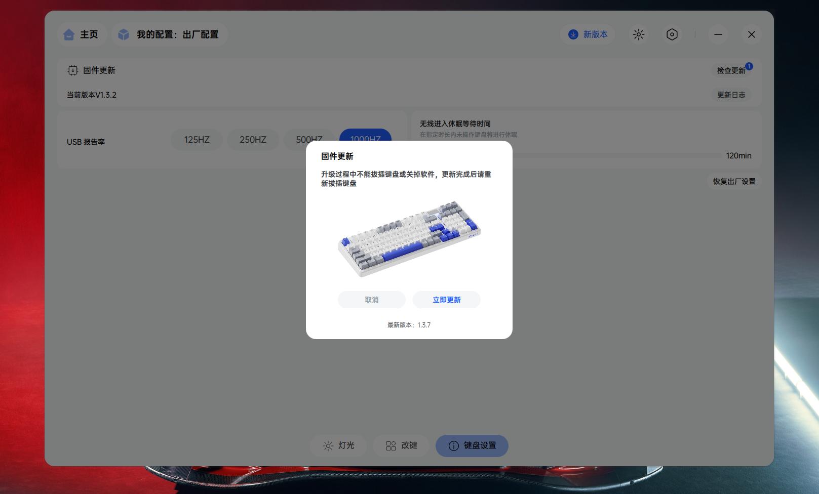 ▲在键盘设置页面,还能随时更新键盘固件,甚至接收器固件也提供了升级!此外驱动也能设置回报率,分别有1000Hz、500Hz、250Hz以及125Hz四个档位。
