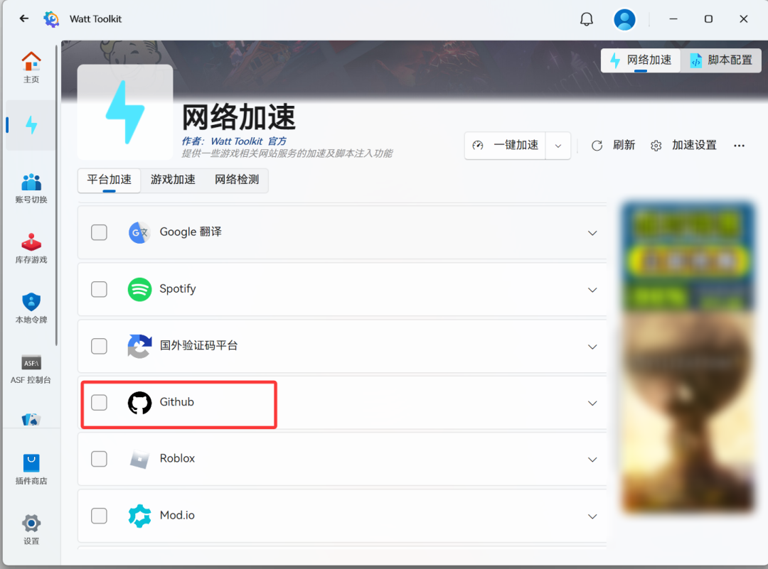 接着勾选“GitHub”后,并点击“一键加速”后等待一会,便开启了加速功能: