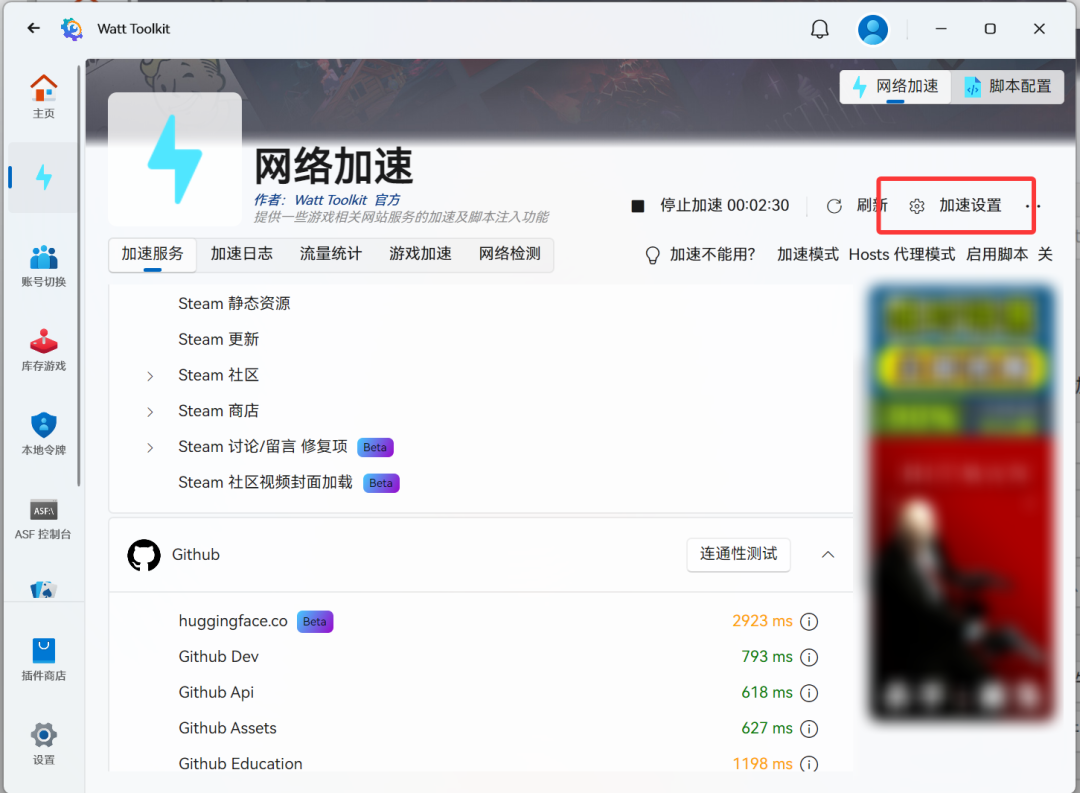 在加速页面点击“加速设置”便会在右侧弹出对应的信息:
