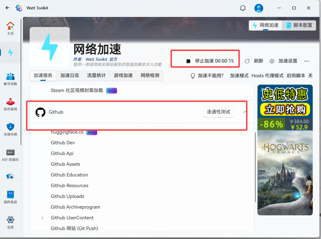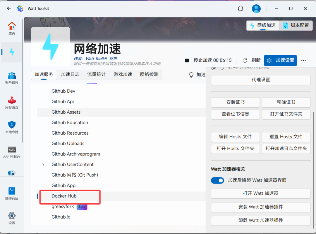 也就是说,使用 Watt ToolKit 基本上能满足访问 GitHub 的需求。除此以外,还能加速 DockerHub: