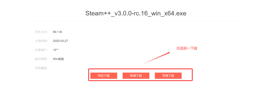 我这里选择“ Steam++_v3.0.0-rc.16_win_x64.exe”,点击后跳转到下载页面: