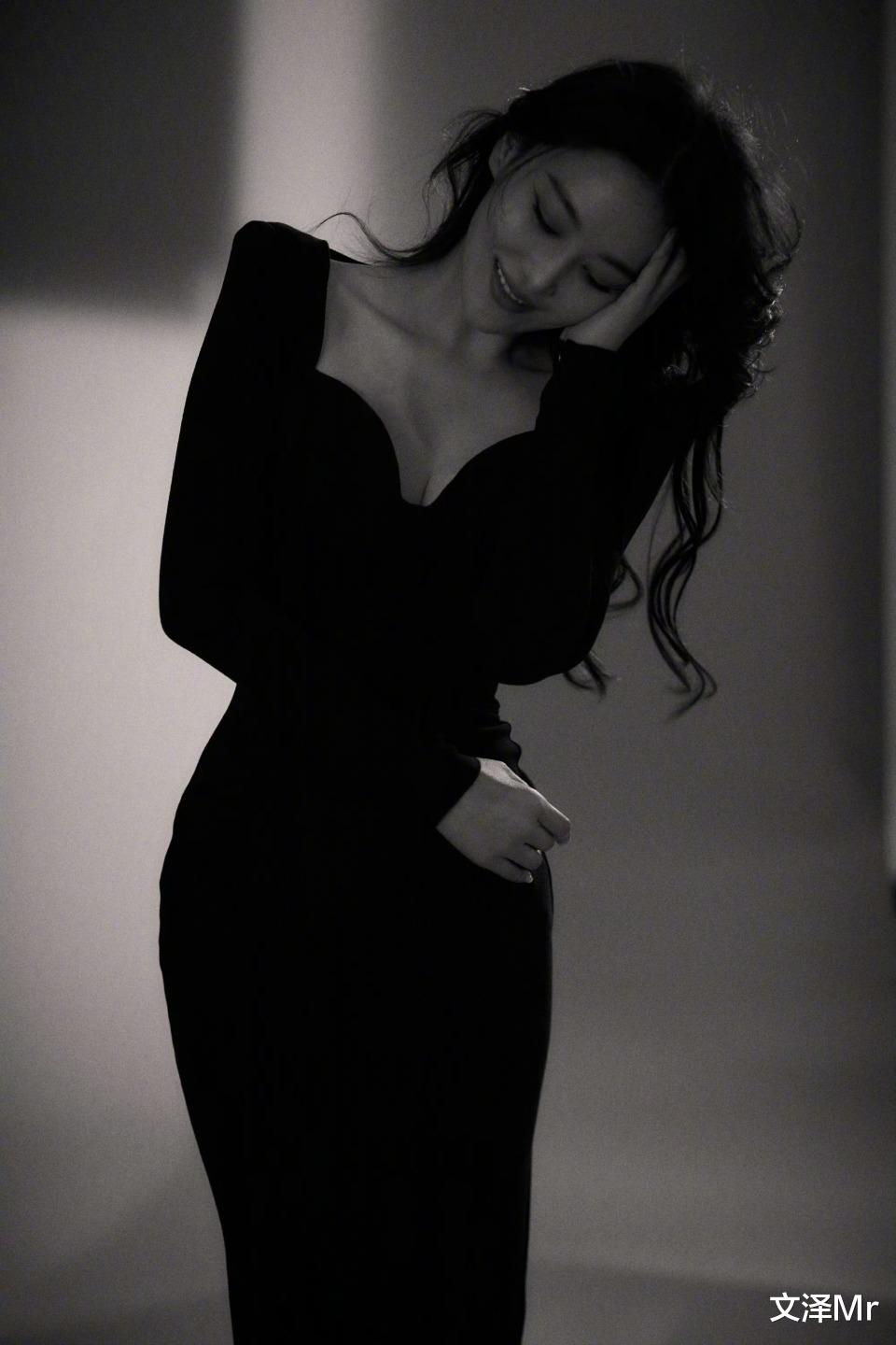 张馨予身着一袭黑色修身长裙,v领设计恰到好处地凸显出她精致的锁骨与迷人的肩线。长袖的款式为整体造型增添了几分优雅与端庄,而修身的剪裁则完美勾勒出她凹凸有致的身材曲线。微风拂过,她的一头乌黑长发轻轻飘动,一手轻抬,一手拨弄发丝,眼神沉静而深邃。成熟女性的韵味与时尚魅力在此刻交融,令人过目难忘。