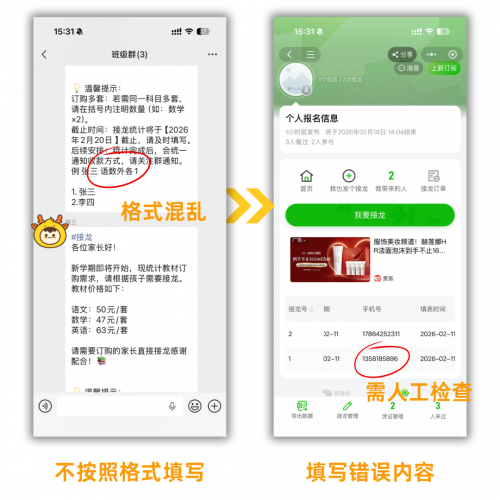 原生接龙没有任何数据整理、导出功能,所有信息都只能在接龙页面查看,且易导致刷屏,影响正常群内交流,整理数据全程全靠手动一个个汇总,耗时长易出错。
