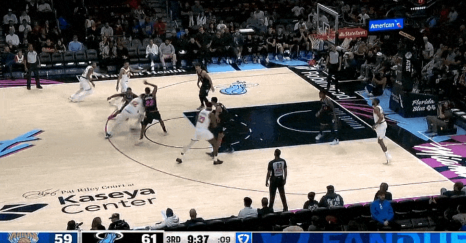 NBA常规赛,尼克斯对阵热火的比赛正在进行中。第三节比赛中,鲍威尔从唐斯手中切球抢断,反击一打零起飞单臂炸框。