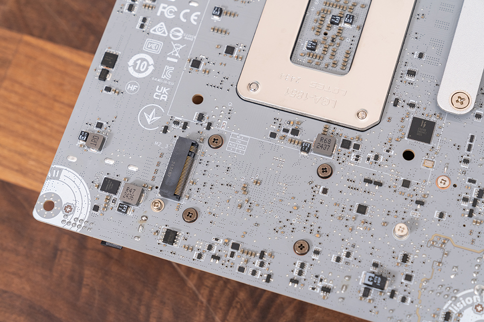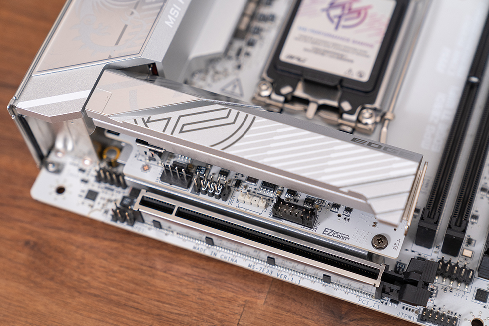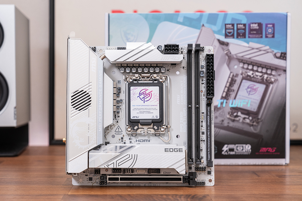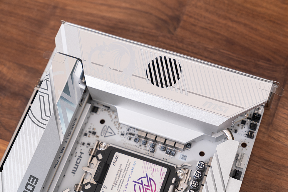 MPG Z890I EDGE TI WIFI作为市面上为数不多的Z890 ITX主板,采用了全白PCB,主板将近三分之一的区域都覆盖了银白色的冰霜散热装甲,通过高亮镜面、磨砂、斜纹切割纹理多种工艺处理,将金属材质带来的精致感体现的淋漓尽致。
