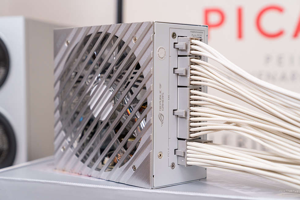 ROG LOKI 850W 电源全模组设计,模组线均采用压纹线,整体触感柔软,更利于走线。,提供3个8pin接口可用于扩展CPU 4+4pin与PCI-E 6+2pin供电,有3个6pin则用于扩展SATA供电以及D型4pin供电,同时提供有1个12+4pin的原生12VHPWR线材接口,可用于扩展600W功率的12VHPWR供电接口。