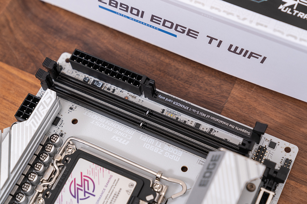 微星MPG Z890I EDGE TI WIFI提供一条PCI-E 5.0 插槽,插槽金属加固处理,采用先进的SMT 焊接工艺(Surface Mount Technology),降低杂讯干扰和电噪声、充分支援更高频宽和传输速度的PCI-E 5.0 讯号。最高 128GB/s的传输带宽。