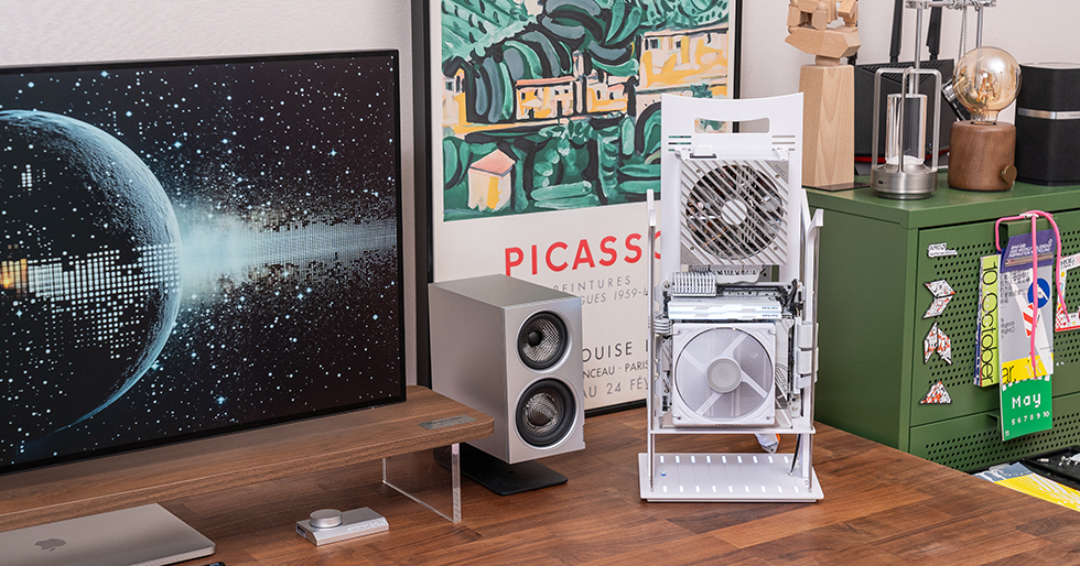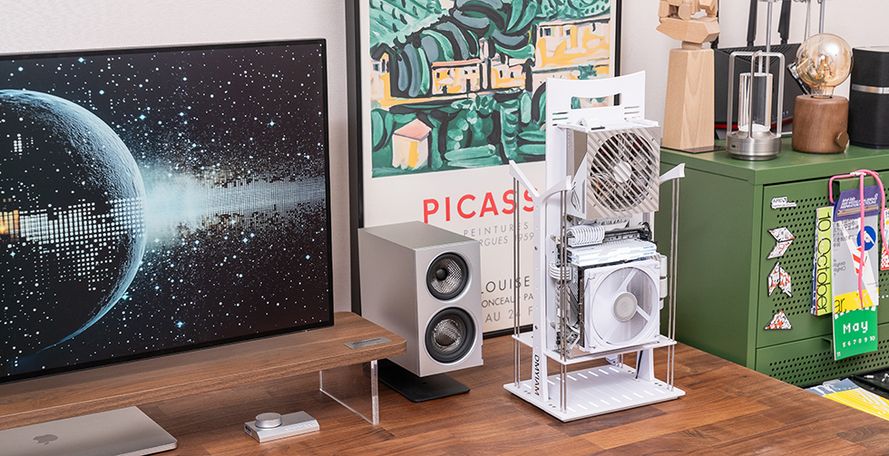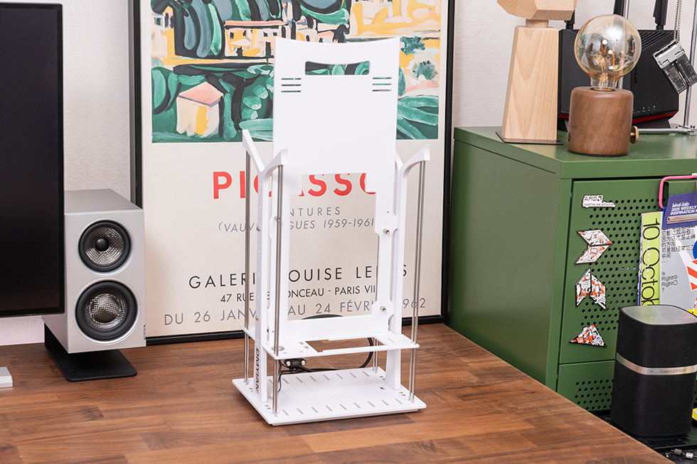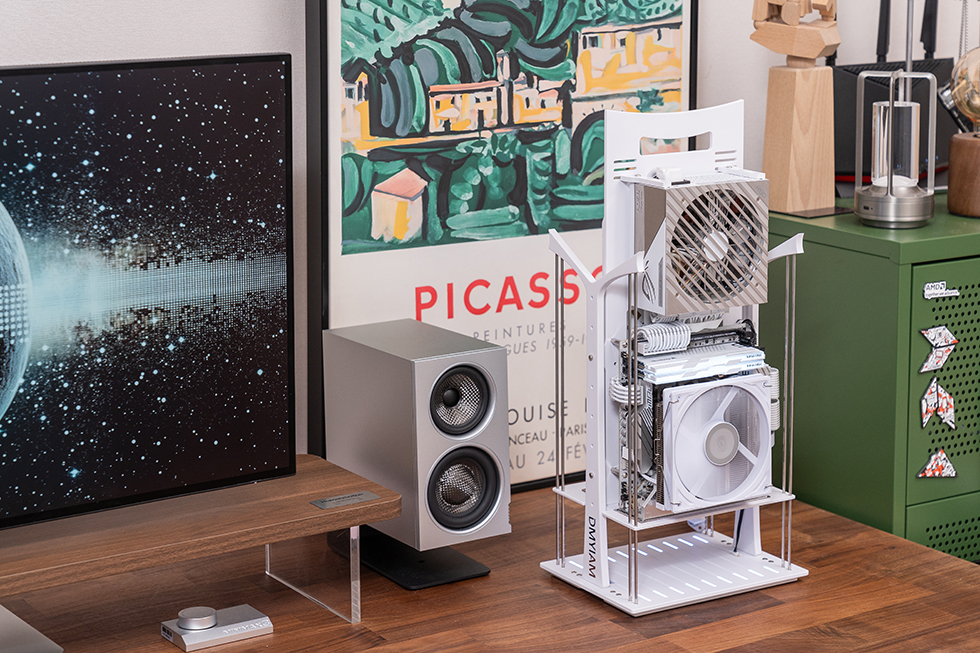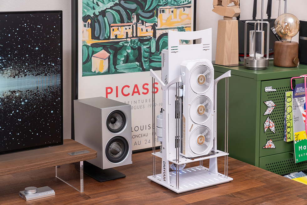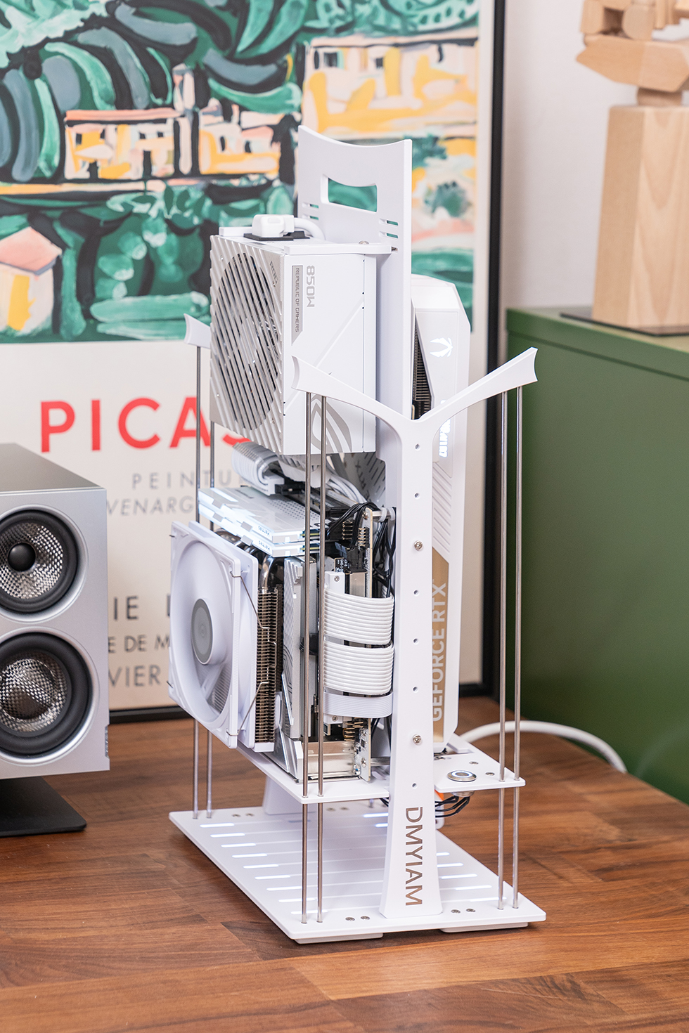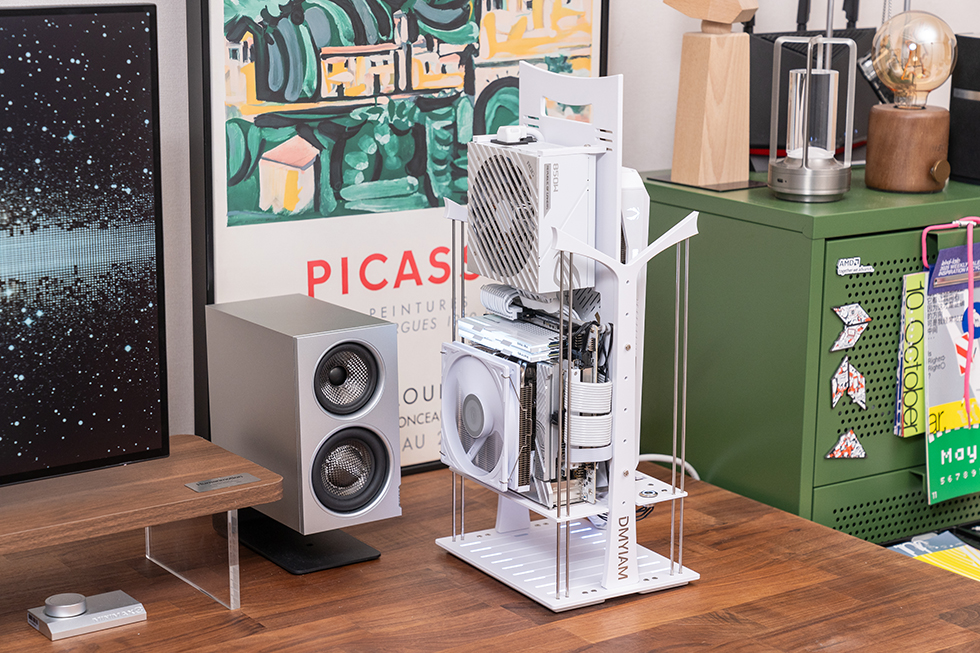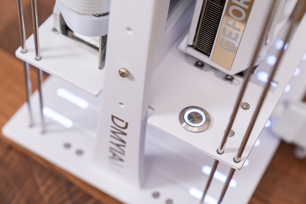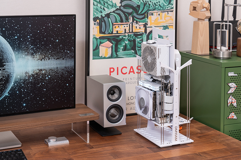 机箱选用了新锐小众品牌DMYIAM多满意的开放式桥架ITX机箱,采用6系铝合金材质,CNC精加工,黑白两色可选。本次使用的白色使用粉末喷涂,工件表面质感细腻,整体以桥架为设计理念,开放式布局能够更全面的展示整体硬件,同时带来极致的散热体验。在兼容性上,支持ITX主板、显卡最大支持3槽位挡板的显卡,长度不限、兼容安装ATX、SFX、SFX-L电源(默认提供SFX支架)、支持安装4个3.5寸机械硬盘。