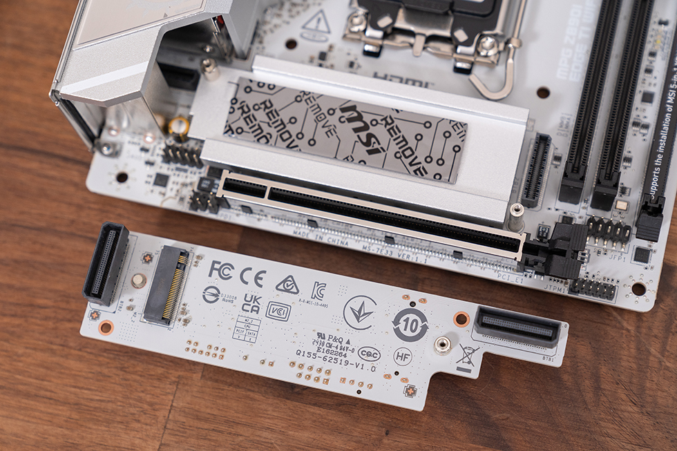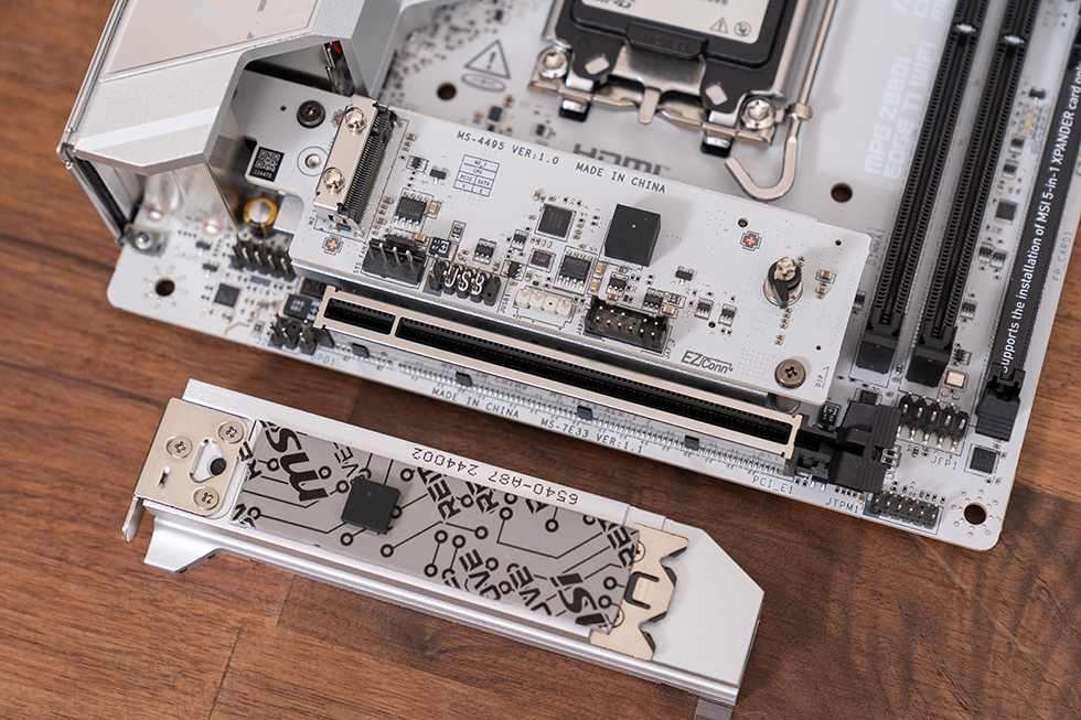 微星MPG Z890I EDGE TI WIFI在主板正面通过垂直堆栈方式将1个 PCIe 5.0 和 1个PCIe 4.0 M.2构建在同一平面上,最上方配备了第2代免工具M.2冰霜铠甲。子卡PCB上的两个M.2均由CPU提供,上层为PCIe 5.0 x4,下层为 PCIe 4.0 x4。子卡上还排布了1个4Pin PWM风扇接口,1个USB2.0接口,1个AGRB接口和1个JAF_2接口,巧妙提升 mini-ITX 扩展能力。
