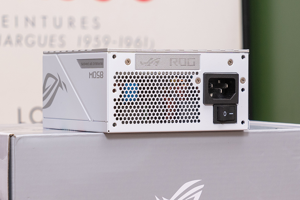 ROG LOKI 850W 电源的尾部,AC输入带有独立开关,面板上方的LOGO名牌镂空设计,通电后风扇上的ARGB灯效可以透出来,形成一种近似于发光LOGO的观感。