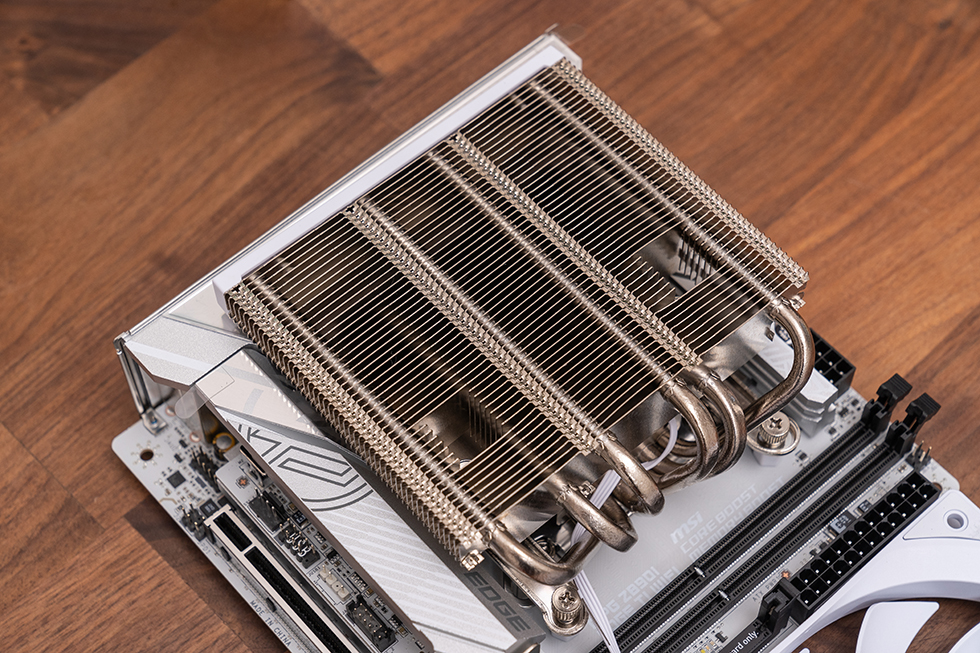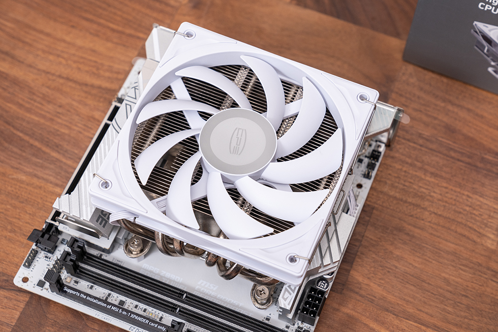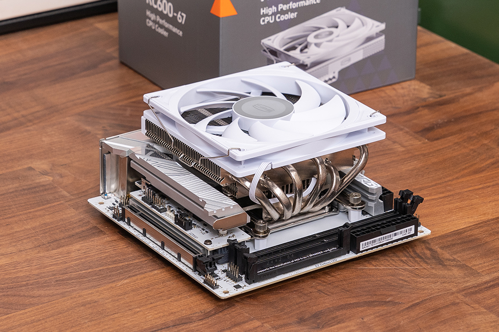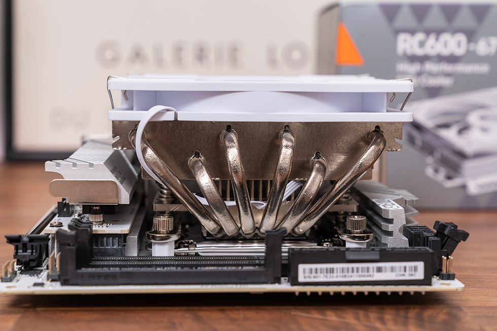 英特尔 酷睿Ultra5 230F处理器功耗和温度都控制的很出色,所以在散热器的选择上下压散热器即可轻松压制,这里选择了超频三的降龙RC600-67,采用了六热管下压式设计,整体规格为120 x 120 x 67.5 mm,下压式的搭配也和整体风格适配。