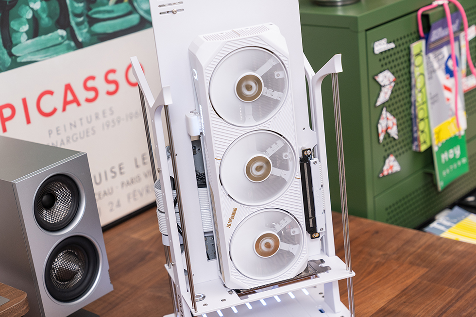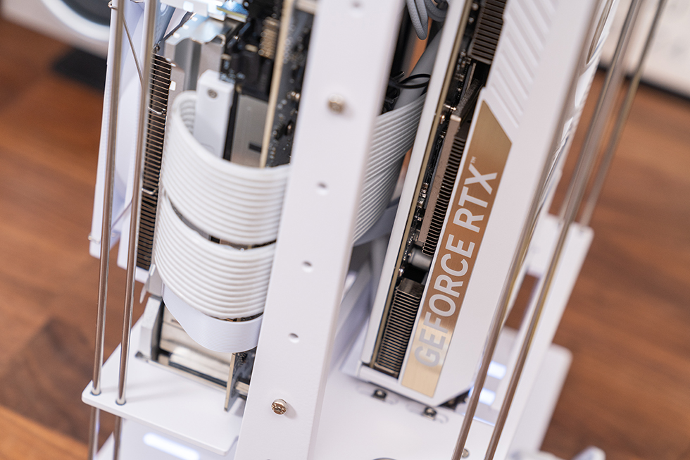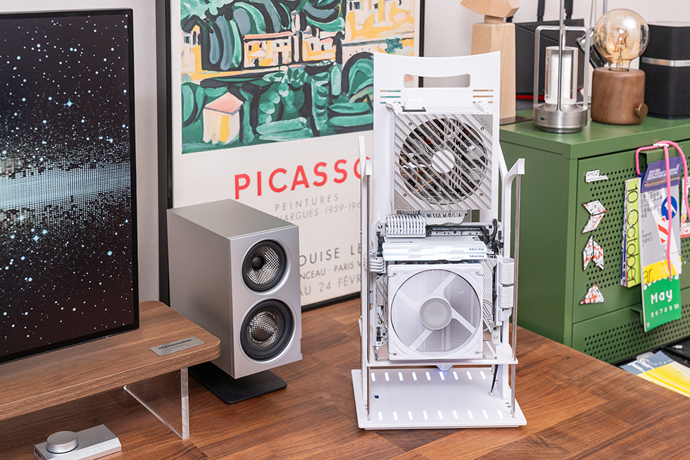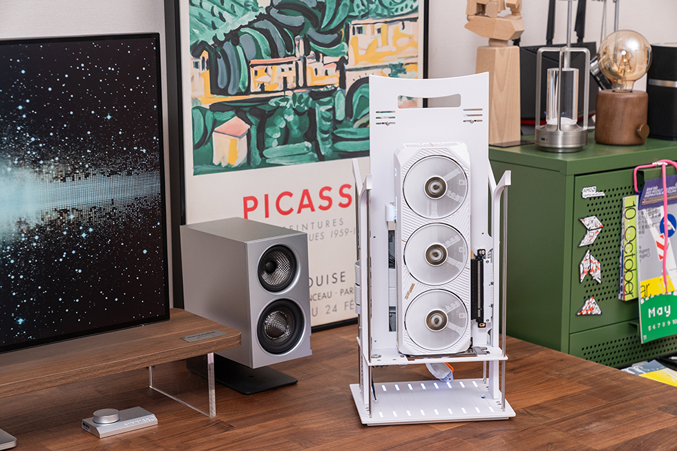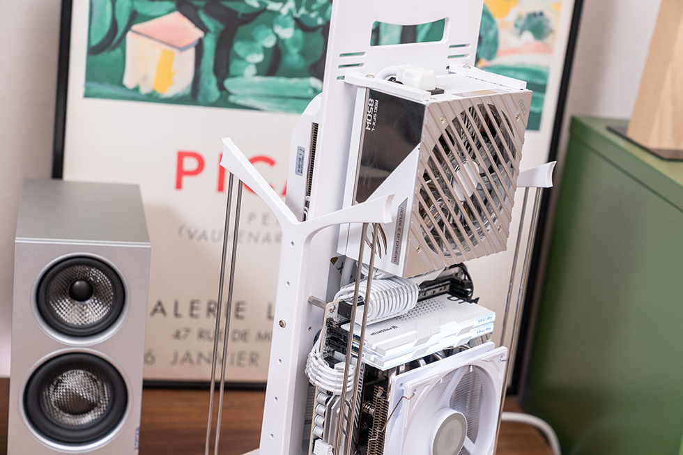 配置层面,采用英特尔酷睿Ultra5 230F处理器(基础功耗65W,最大睿频功耗121W),搭配超频三RC600下压式散热器即可轻松实现温度控制,有效保障CPU运行工况的稳定性;主板选用MSI MPG Z890I EDGE TI WIFI,市面上配置最全面的白色Z890 ITX主板,其丰富的功能配置与接口设计可充分释放处理器性能;辅以宏碁掠夺者8000MHz、48GB高频大容量内存与GM9000 PCIe5.0 2TB存储组合,提供稳定且高速的数据传输链路;显卡采用索泰5070 Ti 16GB SOLID CORE OC,50系列中高端代表型号,无论是应对3A大型游戏还是生产力创作场景均能轻松胜任;电源搭载华硕ROG LOKI 850W,具备高转换效率与足额功率输出能力,可为所有硬件提供稳定供电,避免因供电问题导致的硬件性能波动,全面保障整机硬件系统稳定运行。为最大限度契合“极致冰爽”主题,整机搭载DMYIAM多满意ITX开放式机架,进一步强化散热效能,彻底解决ITX主机“小空间易闷热”的核心痛点。