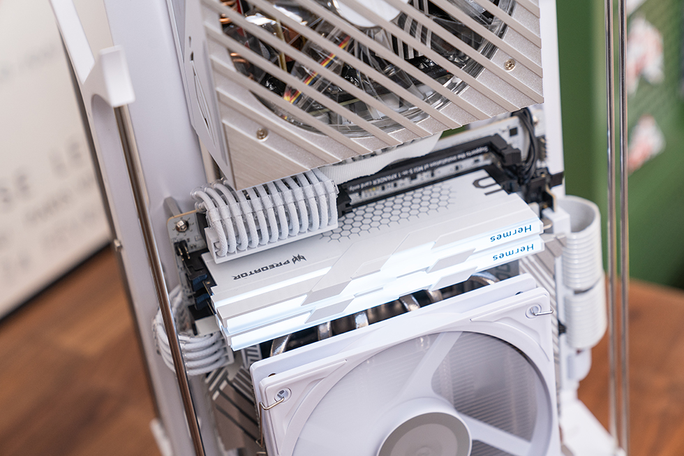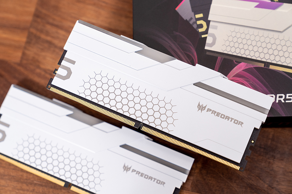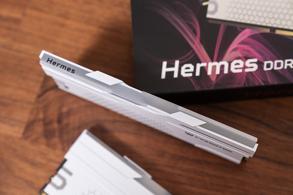 Hermes冰刃系列DDR5内存采用白色全金属散热片,通过斜切线条堆叠和压铸工艺突出了“刃”的主题造型,表面雾面柔光处理并辅以撞色蜂窝涂装进一步提升整体的科技感。