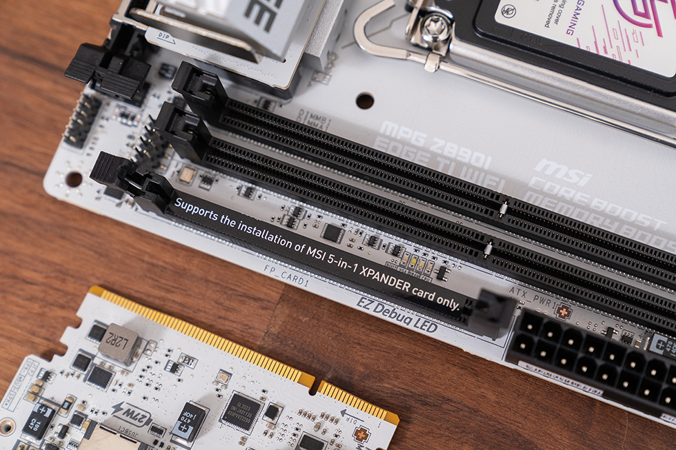 在内存槽边上可以看到,多了一个槽位,专门用于五合一XPANDER 扩展卡,XPANDER 扩展卡提供了丰富的接口,从而弥补ITX版型的扩展局限性。