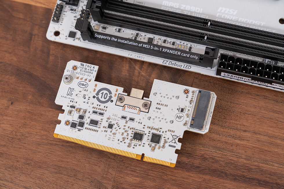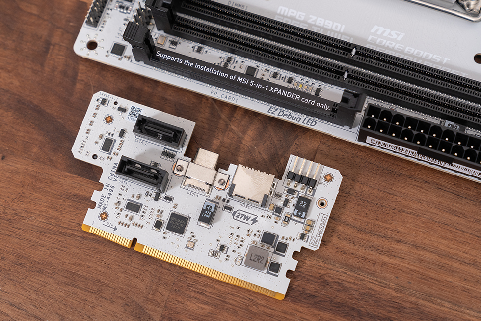 五合一 XPANDER 扩展卡 同样采用了纯白PCB,提供了2个SATA,1个USB 20Gbps Type-C接口,1个USB 5Gbps Type-C接口,1个JFP_2接口;在背面还提供一个M2 Gen4 x 4 64Gbps接口。