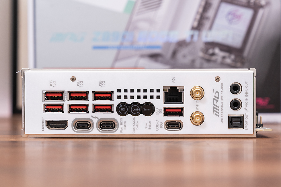 尾部IO提供丰富的接口配置,包括了1个HDMI接口、7个USB 10Gbps Type-A接口、2个雷电4 40Gbps Type-C接口、1个USB 10Gbps Type-C接口、1个Flash BIOS Button、1个Smart Button、1个Clear CMOS Button、1个5G LAN接口、Wi-Fi 7天线接口以及带S/PDIF输出的音频接口。其中网络方面配备 Intel Killer LAN / Killer Wi-Fi,采用intel Killer BE1750x Wi-Fi 7网卡,理论峰值达到5.8Gbps,频宽可达320MHz,支持4096-QAM,同时支持 BT 5.4。搭配 Intel Killer Performance Suite进一步优化网络质量。